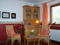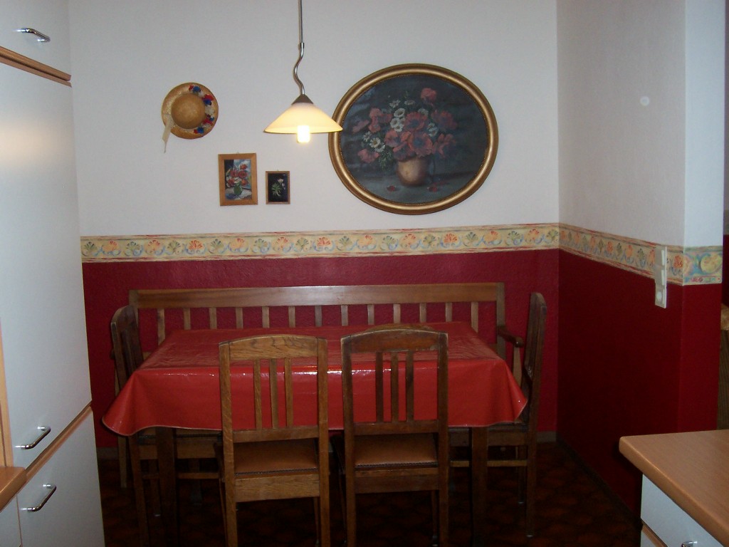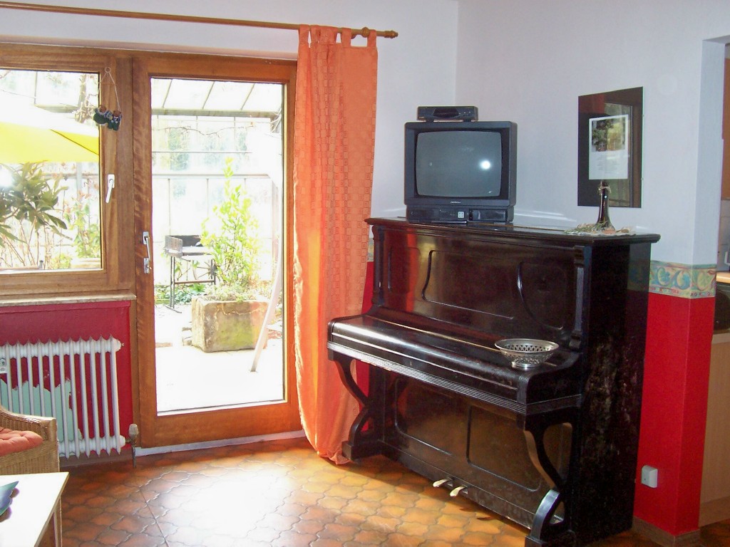 (Spülmaschine), mit Essplatz. Im Wohnraum ein Schlafsofa, Klavier und