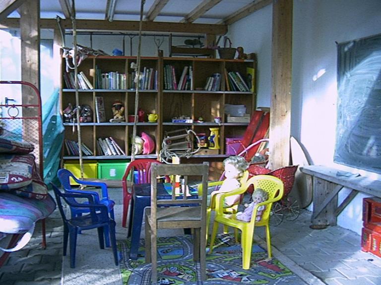 Etagenbett und Waschplatz. Bad mit Wanne. Die große Terrasse im
