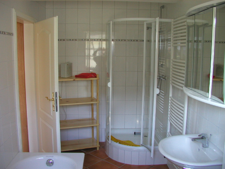 Wohnraum und SatTV ein Bad mit Wanne und Dusche, ein Duschbad.